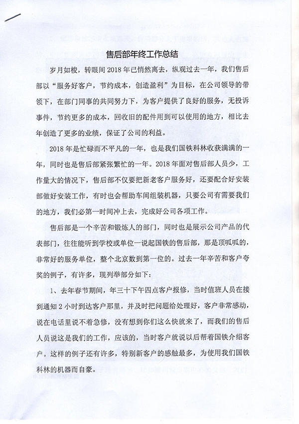 歲月如梭,轉(zhuǎn)眼間2018年已悄然離去,縱觀過去一年,我們售后部以“服務(wù)好客戶,節(jié)約成本,創(chuàng)造盈利”為目標(biāo),在公司領(lǐng)導(dǎo)的帶領(lǐng)下,在部門同事的共同努力下,為客戶提供了良好的服務(wù),無投訴事件,節(jié)約更多的成本,回收舊的配件用到可以使用的地方,相比去年創(chuàng)造了更多的業(yè)績,保證了公司的利益。下面我將售后部對本年度的工作做以總結(jié):