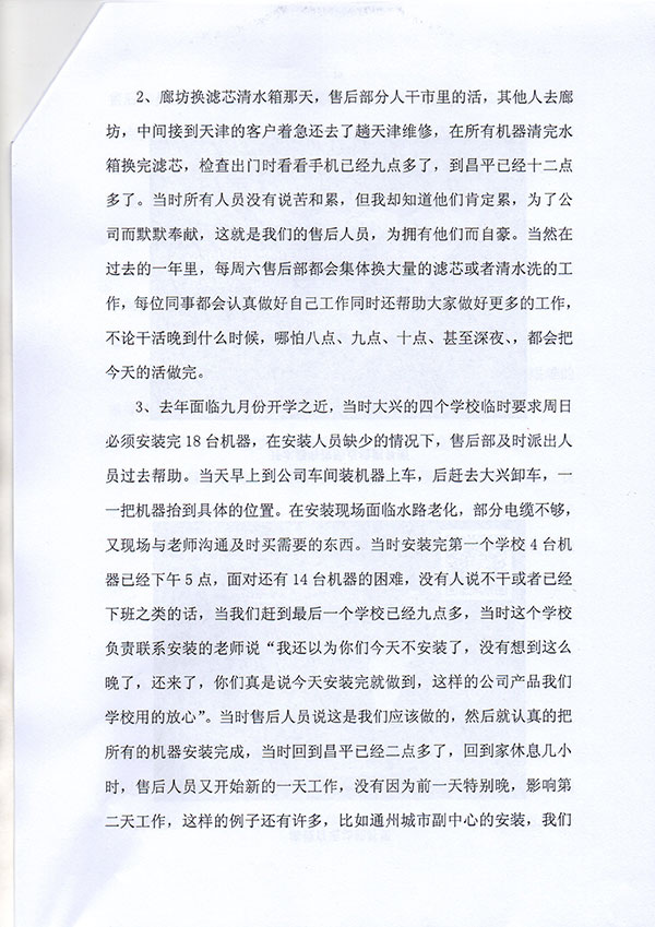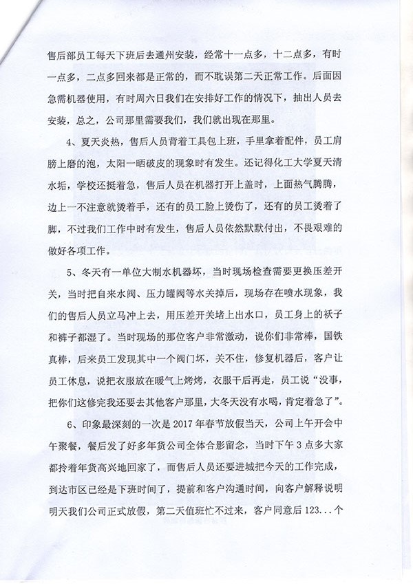 公司李秀田董事長對售后部的工作總結(jié)給出高度贊賞,并做出回復(fù):你們的總結(jié)寫的很好。你們真正做到了工作第一、客戶至上,樁樁事跡感人肺腑。你們用實際行動詮釋了客戶的聲聲贊許,為公司帶來眾多的回頭客戶。望繼續(xù)努力,再創(chuàng)輝煌!向你們致敬!