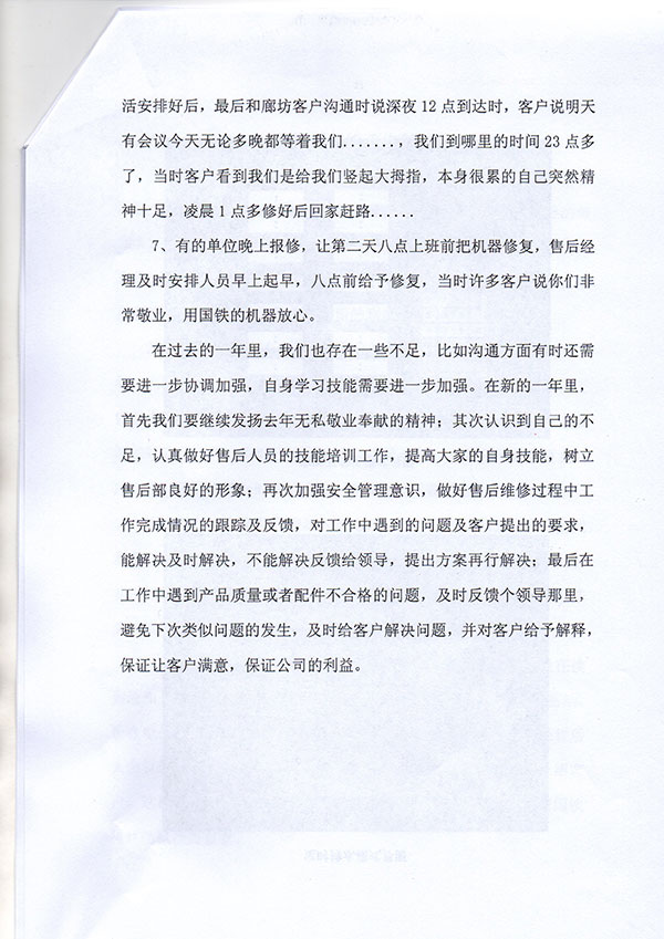 在新的一年里,首先我們要繼續(xù)發(fā)揚去年無私敬業(yè)奉獻的精神;其次認(rèn)識到自己的不足,認(rèn)真做好售后人員的技能培訓(xùn)工作,提高大家的自身技能,樹立售后部良好的形象;再次加強安全管理意識,做好售后維修過程中工作完成情況的跟蹤及反饋,對工作中遇到的問題及客戶提出的要求,能解決及時解決,不能解決反饋給領(lǐng)導(dǎo),提出方案再行解決;最后在工作中遇到產(chǎn)品質(zhì)量或者配件不合格的問題,及時反饋個領(lǐng)導(dǎo)那里,避免下次類似問題的發(fā)生,及時給客戶解決問題,并對客戶給予解釋,保證讓客戶滿意,保證公司的利益。